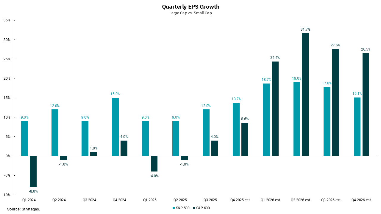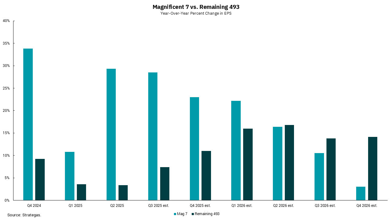 The top chart shows a look at earnings estimates for the Mag 7 versus the S&P “493” (the non-Mag 7 stocks in the S&P 500), while the bottom chart looks at earnings growth estimates for small-cap stocks (S&P 600) versus large-cap (S&P 500). In both instances, we are seeing a shift from what has driven the market over recent quarters. Within the large-cap space, we anticipate earnings growth for the S&P 493 to outpace that of the Mag 7 by the second quarter of 2026. Looking at small-cap versus large-cap, we anticipate smallcap earnings outpacing large-cap earnings beginning in the first quarter of 2026.