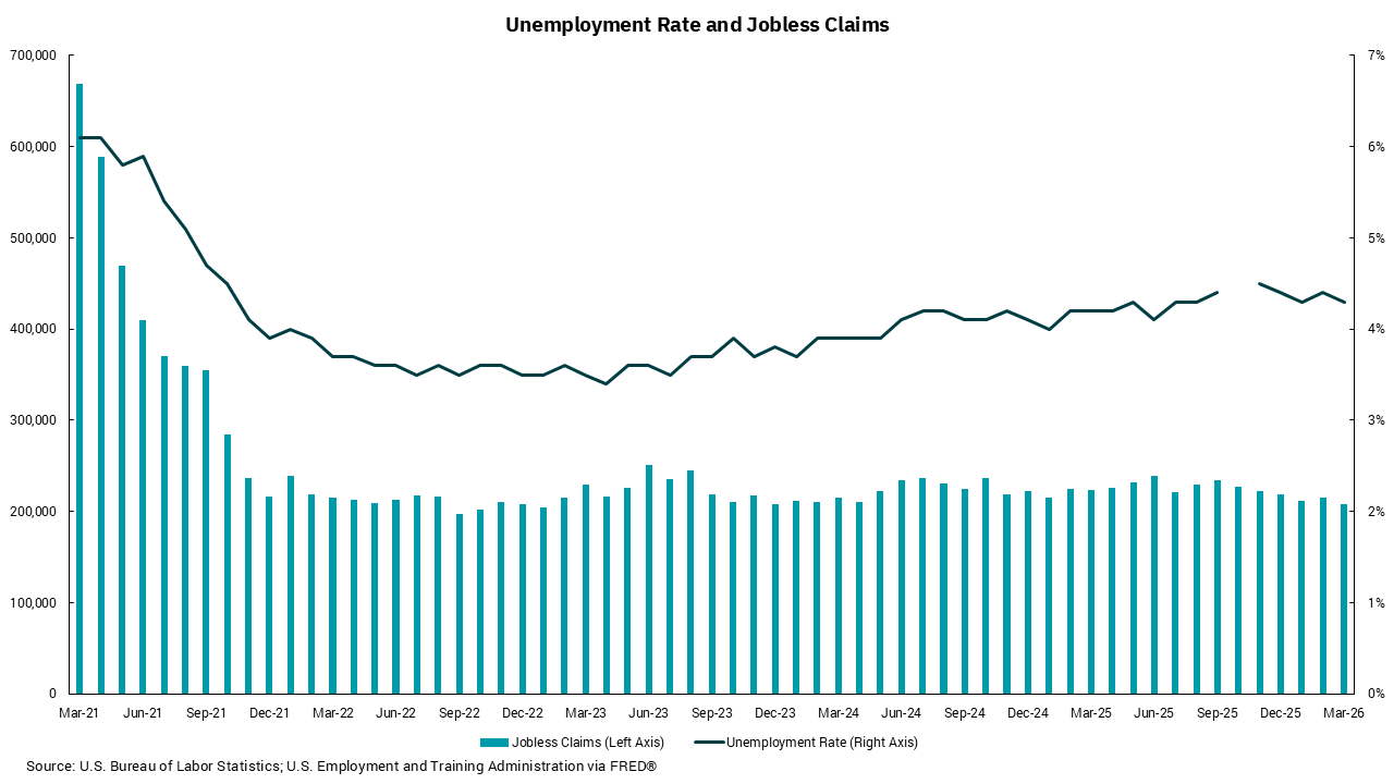 Our chart this week helps illustrate this. The solid line shows the headline unemployment rate (U3) while the bar chart shows the number of new unemployment claims within the weekly jobless claims report. Note the break in the line measuring the unemployment rate which was caused by the government shutdown and the decision to not release the report for November 2025. What we see is an unemployment rate that is higher than a couple of years ago but still low—4.3%, as of March—in historical terms. Even more extraordinary is the ongoing generational low in weekly jobless claims, especially when considering that the size of the U.S. labor force is over 170 million people and weekly jobless claims last week were 202,000. These are numbers we last saw in the 1960s when the labor force was much smaller.